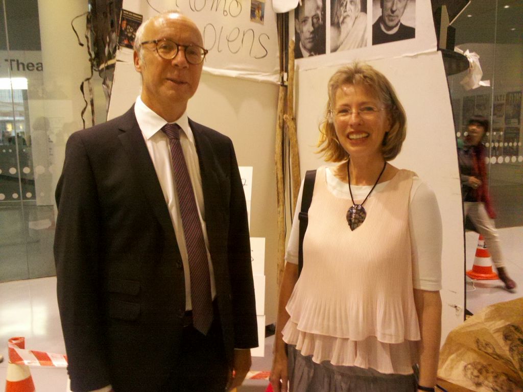 Bild von Charlotte Esch vor ihrer Arbeit im Mittelrheinmuseum Koblenz Bild des Kulturdezernenten der Stadt Koblenz Detlef Knopp mit Charlotte Esch im Mittelrheinmuseum